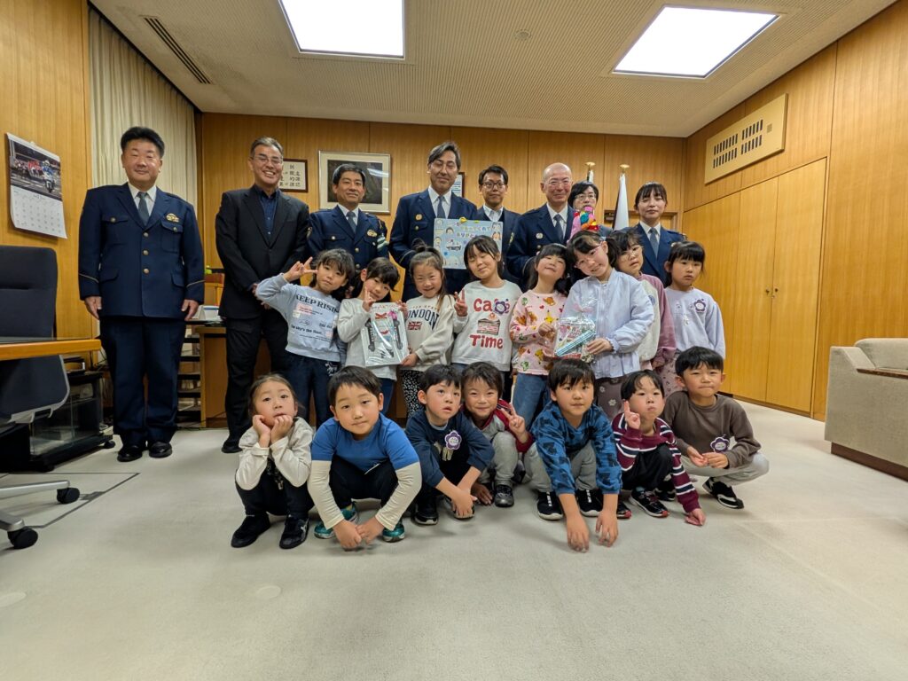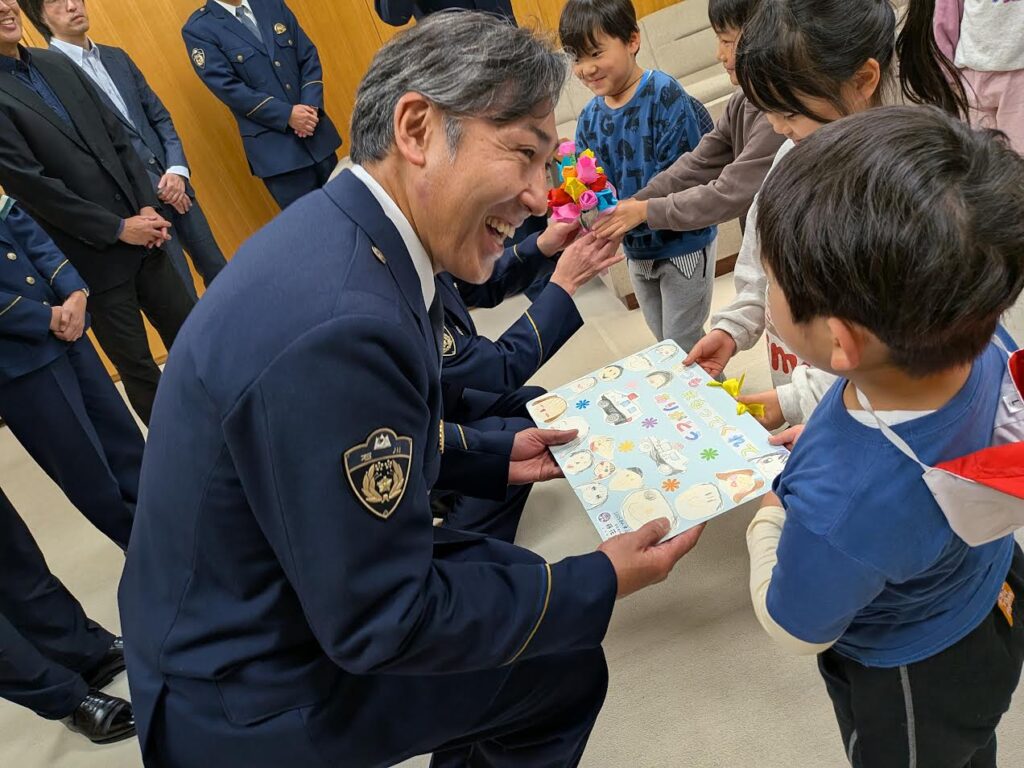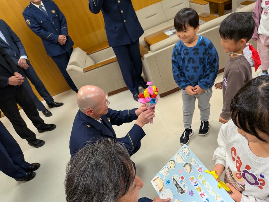 身の回りの安全や交通事故から守ってくれる「おまわりさん」に感謝を伝えるために年長組16人は西警察署を訪れました。「おまわりさん」に日頃の感謝を伝え園児たちが色紙で作った花束を渡してきました。署長室に入った時は緊張して顔が固まってしまいましたがみんなで感謝の気持ちを伝えることができました。署長さんは「大きくなったら、おまわりさんになって下さい」と言ってくれました。おまわりさんと記念写真を撮ってもらい帰りにはお土産を頂きました。ありがとうございました。